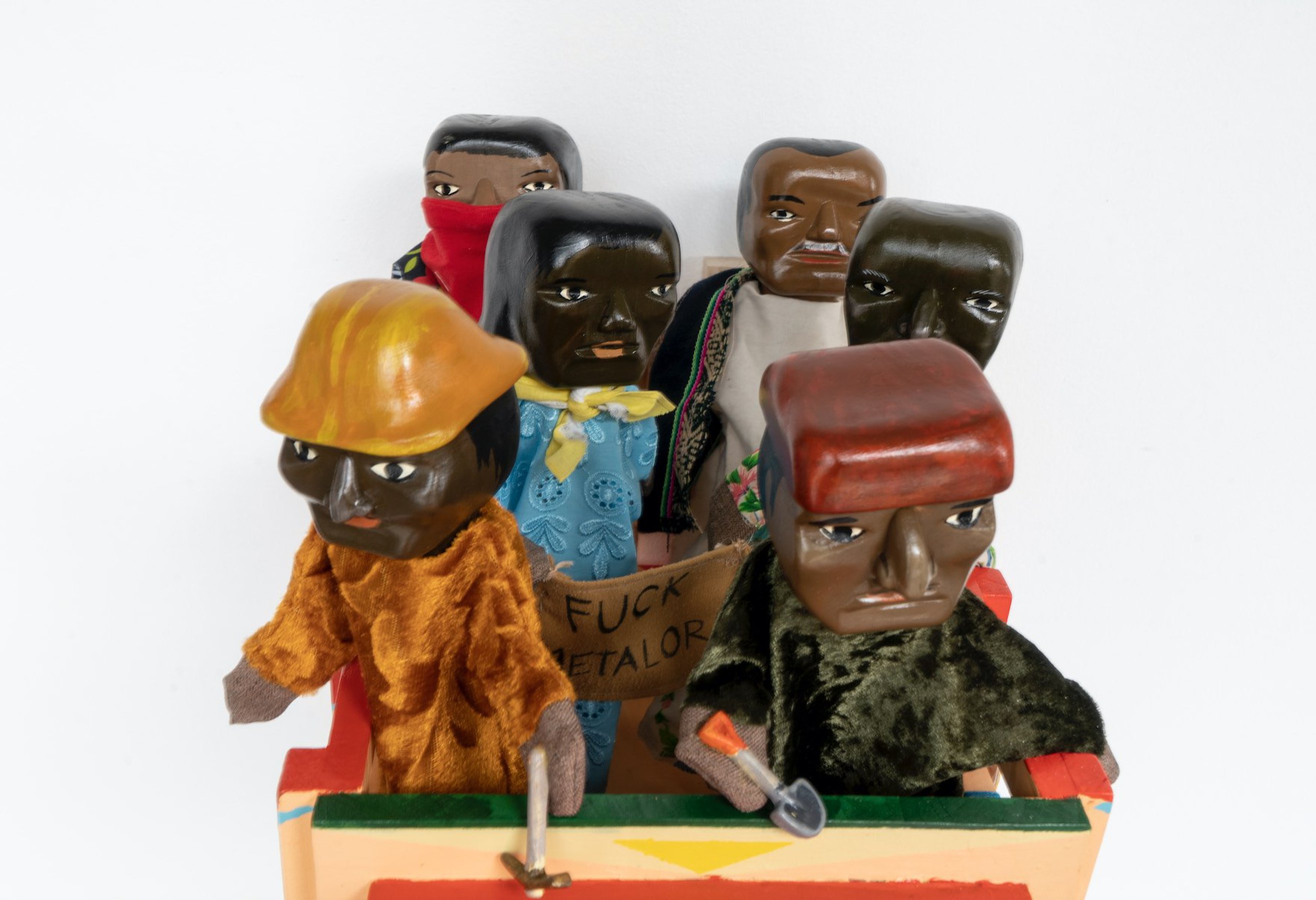 wood puppet theatre, 14 puppets wood hand-carved, sewn, knitted and embroidered costumes (25 cm each), wood toy model truck (58 x 30 x 27 cm), 6 dolls, 3 curtains